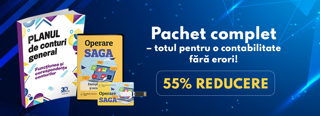 Achizitionati pachetul format din Planul de conturi general. Functiunea si corespondenta conturilor + Operare Saga. Exemple practice si recomandari la pretul de 110 lei + 11 TVA, redus cu 55% de la 244 de lei + 11 TVA!